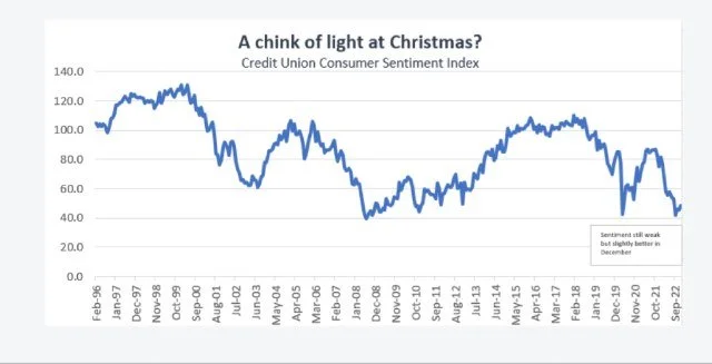 The Credit Union Consumer Sentiment Index increased to 48.7 in December from 45.3 in November. This marks the second improvement in the past three months and, as there were only four increases in the past twelve months, it tentatively suggests that consumers now feel they have prepared themselves in so far as possible for very challenging economic and financial conditions. In the same vein, as the diagram below illustrates, while the December reading may be low by the historic experience of the survey, it is at its best level since August when the threat of very expensive light and heating this winter began to loom large.