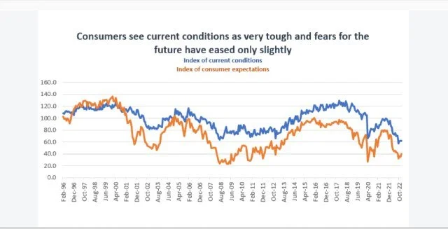 If the ‘macro’ elements of the survey reflect consumer thinking on issues beyond their everyday dealings, the other elements are grounded in their first-hand experience. The current conditions sub-index measures consumers assessments of how their household finances have evolved and whether it is now a good or bad time to make major purchases. As the diagram below illustrates, the November survey saw the weakest reading in current conditions in the twenty-six plus years of the survey. December saw only a marginal improvement suggesting most consumers are still experiencing significant financial pressures.