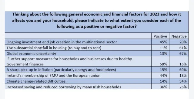 Although a non-negligible 16% of consumers may view extensive fiscal supports as a matter of concern, a substantial 59% see Government support measures as an important positive influence on prospects for 2023. The 20% of consumers who see multinational sector activities as a negative likely include significant numbers who may be worried about excessive dependence on this sector, However, just under half of Irish consumers (45%) see ongoing multinational investment in Ireland as a favourable influence on the outlook for the year ahead.
